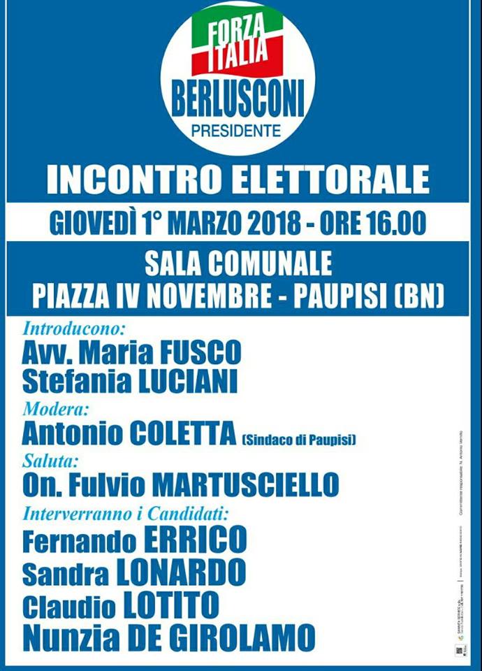 Benevento. Incontro elettorale di Forza Italia a Paupisi – 1 marzo 2018